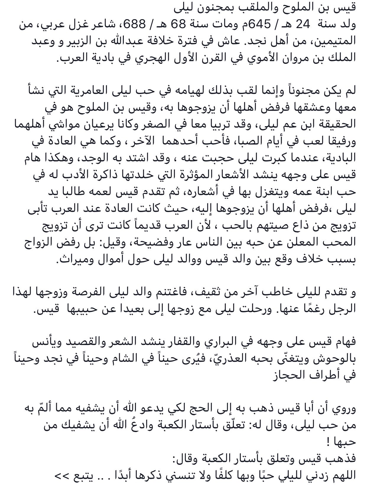 مجنون ليلى شعر قيس بن الملوح. قيس بن الملوح والملقب بمجنون ليلى 24 هـ 645م 68 هـ 688 شاعر غزل عربي من المتيمين من أهل نجد عاش في فترة خلافة مروان بن الحكم وعبد الملك بن مروان في القرن الأول من الهجرة في بادية العرب. قيس ابن الملوح أو ما يعرف باسم مجنون ليلى هو من أشهر شعراء العصر الإسلام وهو من بني نجد وترجع قصته واشتهاره بحب ليلى قريبته التى رفض أهلها أن يزوجوها له فأخذ ينشد فيها الأشعار ويبين جمالها ومقدار. شاعر الغزل العربي عاش بفترة خلافة مروان بن الحكم وعبد الملك بن مروان لقب بمجنون ليلى لهيامه في حب ليلى العامرية ورفض أهلها أن يزو جوها به فهام على وجهه يتغنى بحبه العذري فيها إلى أن مات. قيس بن الملوح قيس بن الملوح بن مزاحم العامري مجنون ليلى شاعر غزل من المتيمين من أهل نجد وقد أنكر قوم وجوده قائلين.